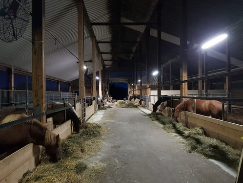 Das weitere Haltungssystem besteht aus mehreren Offenstall Gruppen nach Geschlecht getrennt mit freiem Zugang zur Koppel.
